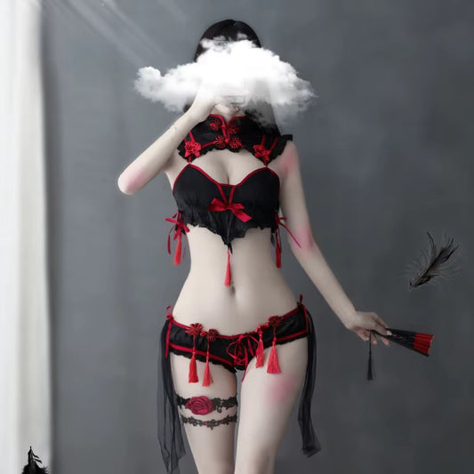 Sexy Cosplay Traditional Dress for Women Gothic Punk Little Devil Bra Set Black Red Cheongsams Party Fashion Solid Color Satin V